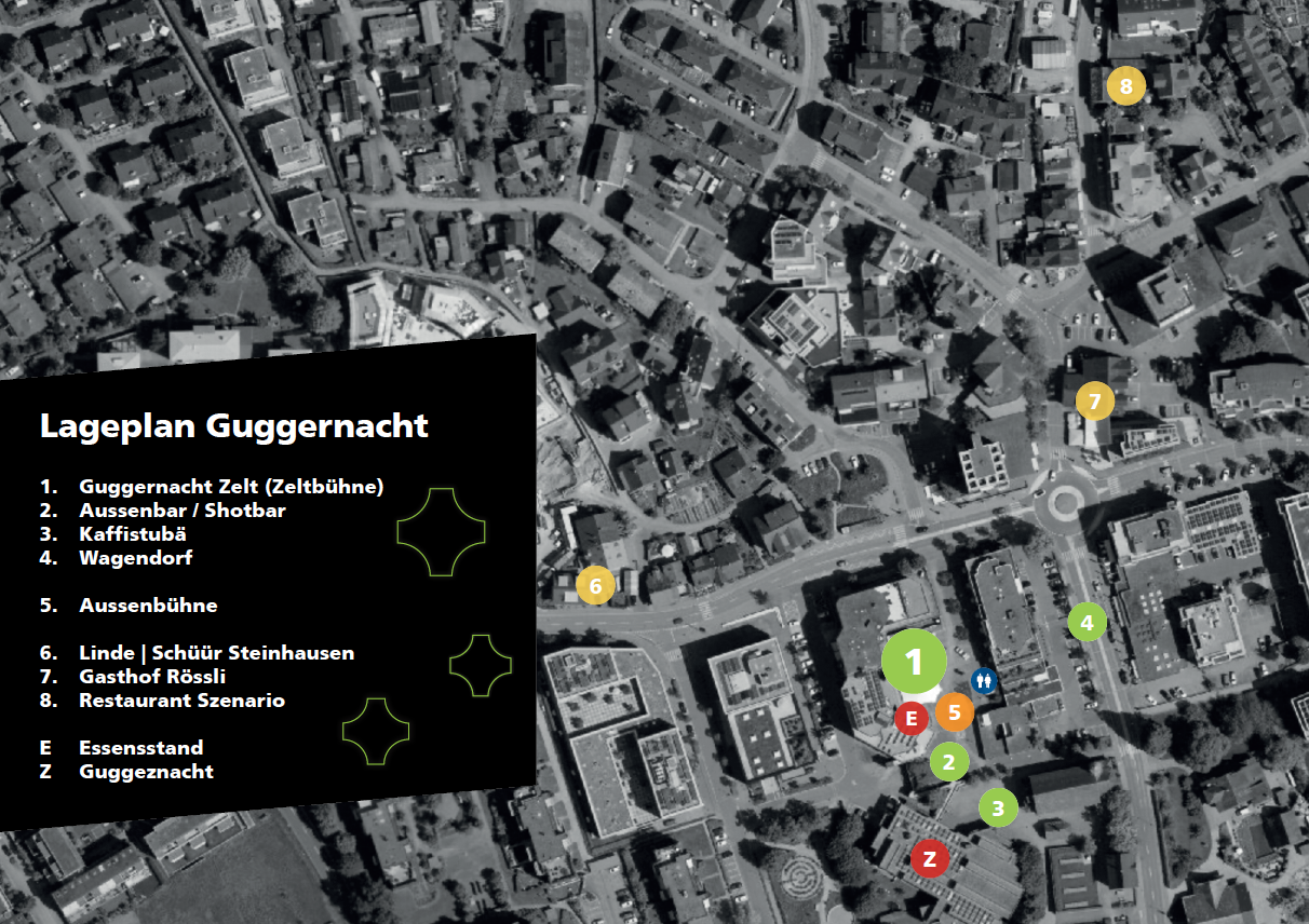 Mit der Schliessung der Strasse während dem Umzug und der Guggernacht wird sowohl der Dorfplatz wie auch das Zentrum um den Dorfkreisel in ein riesiges Fasnachtsdorf verwandelt. Auf unserem Lageplan siehst du detailiert wo du welche Highlights findest.
